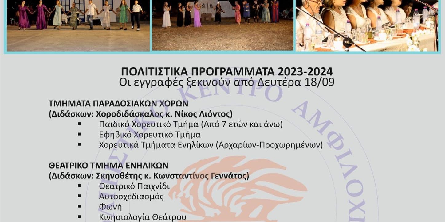 Με ιδιαίτερη χαρά σας ανακοινώνουμε την έναρξη εγγραφών στα τμήματα του Πολιτιστικού Κέντρου Αμφιλοχίας.