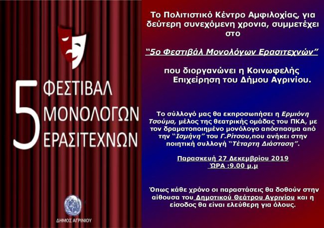 Την Παρασκευή 27 Δεκεμβρίου 2019 και ώρα 21:00 στην αίθουσα του Δημοτικού Θεάτρου Αγρινίου το Πολιτιστικό Κέντρο Αμφιλοχίας, για δεύτερη συνεχόμενη χρονιά,θα συμμετέχει στο ”5ο Φεστιβάλ Μονολόγων Ερασιτεχνών”. Το σύλλογό μας θα εκπροσωπήσει η κ.Τσούμα Ερμιόνη μέλος της θεατρικής ομάδας του Π.Κ. Αμφιλοχίας, με τον δραματοποιημένο μονόλογο απόσπασμα από την “Ισμήνη” του Γ. Ρίτσου που…