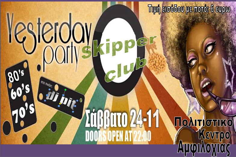 Tο Πολιτιστικό Κέντρο Αμφιλοχίας, διοργανώνει το Σάββατο 24 Νοεμβρίου στο Club Skipper ενα πάρτυ όλο αναμνησεις!! Ελάτε να χορέψουμε στους ρυθμούς των πιο μουσικά επιτυχημένων δεκαετιών.. Tιμή εισόδου 6€…