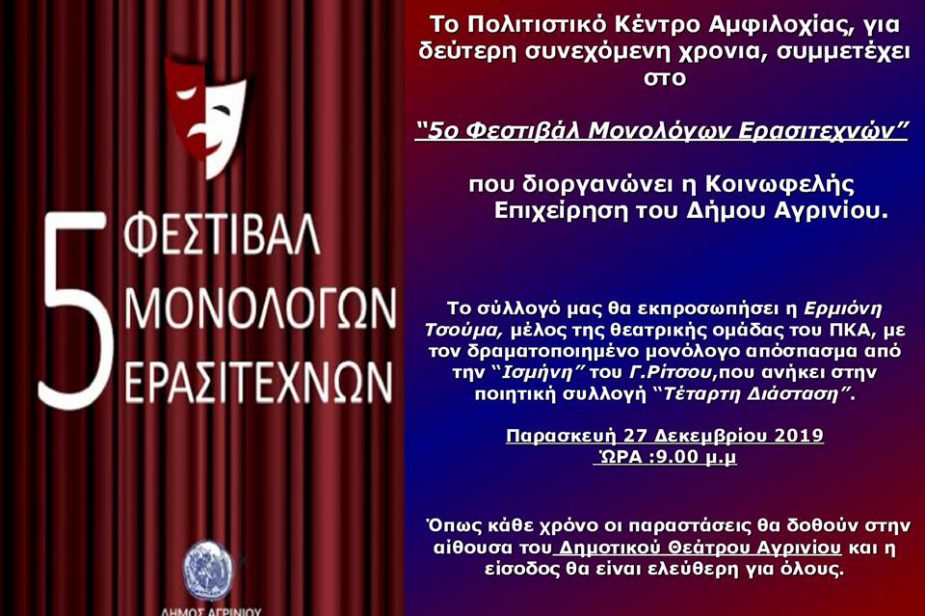 Την Παρασκευή 27 Δεκεμβρίου 2019 και ώρα 21:00 στην αίθουσα του Δημοτικού Θεάτρου Αγρινίου το Πολιτιστικό Κέντρο Αμφιλοχίας, για δεύτερη συνεχόμενη χρονιά,θα συμμετέχει στο ”5ο…