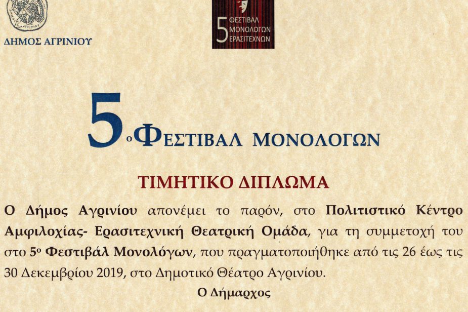 ΤΙΜΗΤΙΚΟ ΔΙΠΛΩΜΑ στο Πολιτιστικό Κέντρο Αμφιλοχίας – Ερασιτεχνική Θεατρική Ομάδα , για τη συμμετοχή, της κ.Τσούμα Ερμιόνης στο 5ο Φεστιβάλ Μονολόγων Ερασιτεχνών,που πραγματοποιήθηκε από τις…
