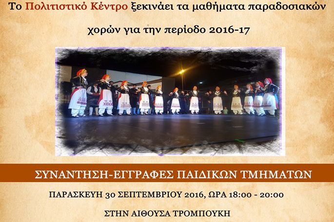 Το Πολιτιστικό Κέντρο Αμφιλοχίας, ανακοινώνει την έναρξη λειτουργίας των χορευτικών τμημάτων για την περίοδο 2016-2017. Συγκεκριμένα, για τα παιδικά τμήματα, η πρώτη συνάντηση και εγγραφές, έχουν προγραμματιστεί για…